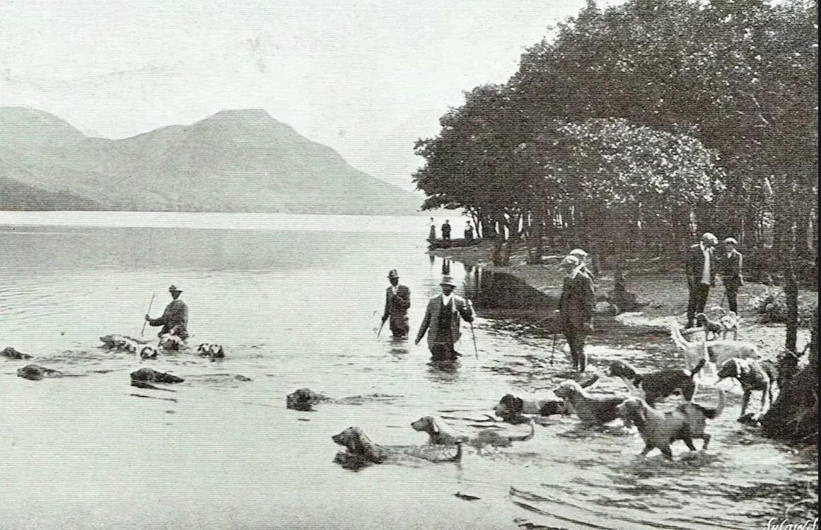 The West Cumberland Otterhounds cool off in Crummock Water, 1911
